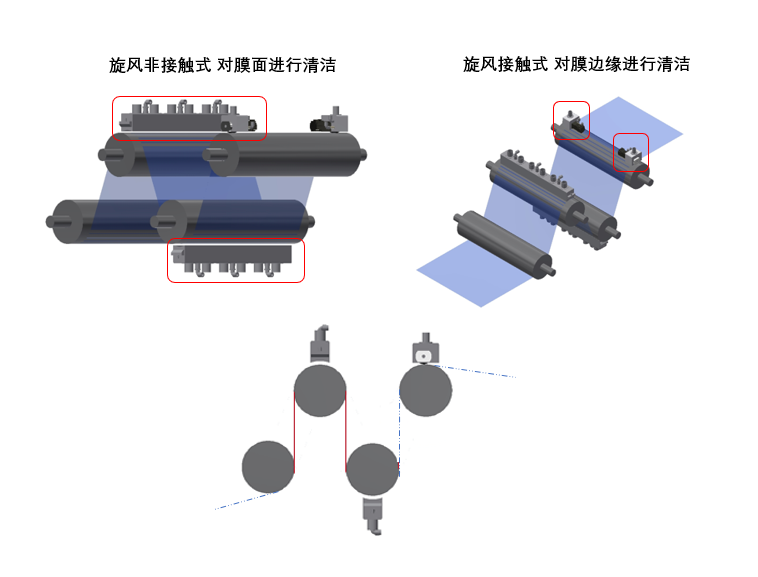 薄膜、卷板對(duì)應(yīng)型旋風(fēng)模組設(shè)計(jì)保持了平面型和微小器件對(duì)應(yīng)型的外觀與內(nèi)部整體結(jié)構(gòu),并針對(duì)卷板/薄膜/膜片制造工藝中的大寬幅、裁切后邊部處理再清潔、除異物毛刺等需求,進(jìn)行高旋軸與特制氣嘴的優(yōu)化排列,可滿足現(xiàn)有干燥爐、再?gòu)?fù)合、精度提升等新工藝中的潔凈度要求。